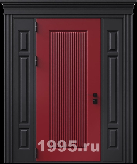 Стальная термодверь с металлофиленкой, вставками по бокам, карнизом и двухцветным порошковым окрашиванием RAL 3004 и RAL 9004 (тип №2)